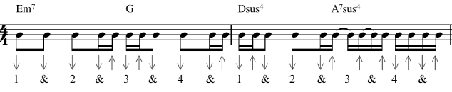 First off, the guitar in the song itself is simple, yet stunning, especially in the beginning. Only using the 4 chords of (Em7, G, Dsus4 and A7sus4) in its verse and 3 chords in its chorus (Cadd9, Dsus4 and Em7), along with having a relatively simple strumming pattern (seen below), at a quick glance this song looks plain and unimportant, yet it is that simple nature of the song that makes it so catchy. Every chord correlates perfectly with a change in line, and as the sound of the guitar changes to a lower/higher pitches, the lyrics seem to correlate with that tone shift. For example, in verse two there is an evident swell in music between the second and first line, which the lyrics compliment by having a call of action ‘Backbeat, the word is on the street that the fire in your heart is out’ (Get out there, prove the naysayers wrong!). (image)